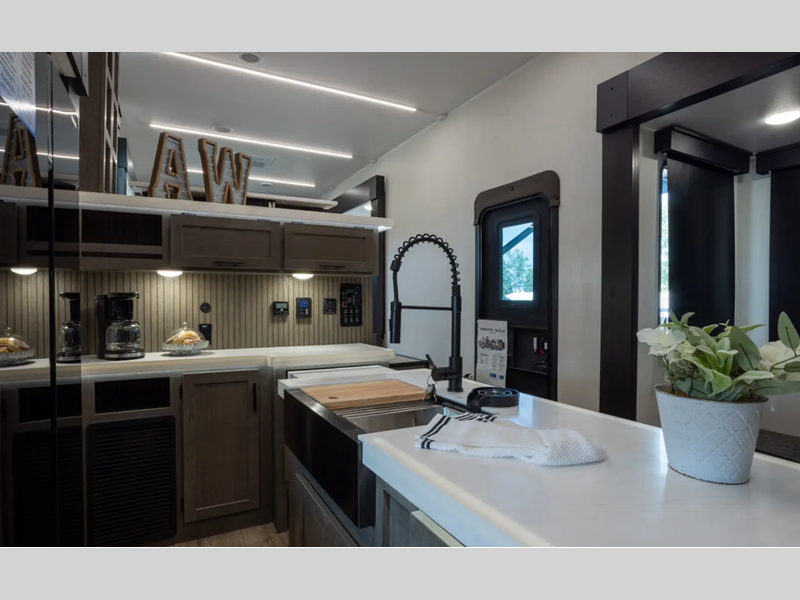 Each model features a king bed slide out, which is what set these Suite models apart from the Arctic Wolf models. Along with the added bedroom space, you'll also enjoy a second A/C unit, more storage space in the bedroom, and a "SuperStor" dual cavern basement storage compartment so nothing gets left behind. You'll feel right at home with the kitchen appliance and hardware package, plus carpetless floor design, and floor level motion sensing lights in the bedroom, bathroom, and interior steps.