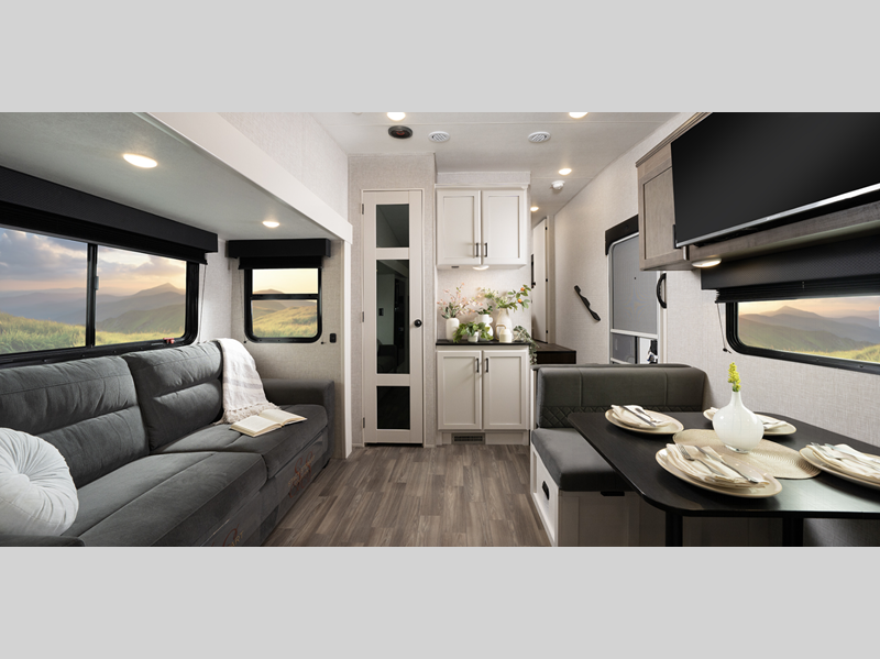 Sleeps 5 Slides 3 Length 33 ft 9 in Ext Width 8 ft 1 in Ext Height 12 ft 3 in Int Height 8 ft 5 in Interior Color Calli Linen Hitch Weight 1650 lbs GVWR 10900 lbs Dry Weight 9205 lbs Cargo Capacity 1695 lbs Fresh Water Capacity 52 gals Grey Water Capacity 82 gals Black Water Capacity 45 gals Tire Size ST225/75R15E Furnace BTU 30000 btu Available Beds Queen Refrigerator Type 12V Refrigerator Size 8 cu ft Cooktop Burners 3 Number of Awnings 1 LP Tank Capacity 30 lbs Water Heater Type Tankless AC BTU 15000 btu Awning Info 15' Power w/LED Lighting Axle Count 2 Number of LP Tanks 2 Shower Type Standard Electrical Service 50 amp Similar Floorplans