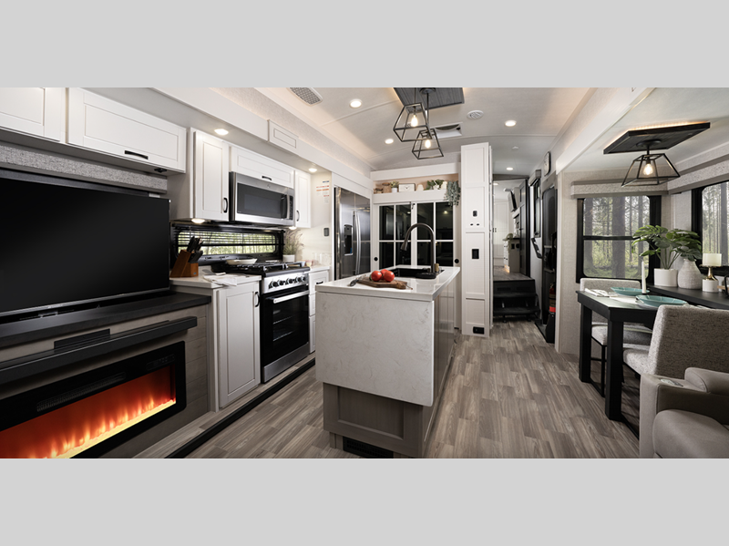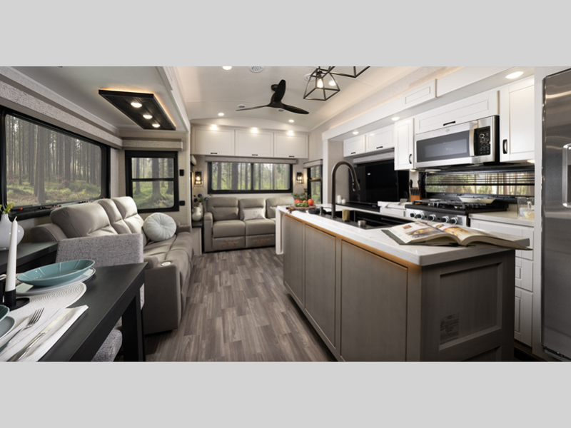 Sleeps 6 Slides 5 Length 43 ft 10 in Ext Width 8 ft 6 in Ext Height 13 ft 3 in Int Height 8 ft 6 in Interior Color Modern Farmhouse Exterior Color Mineral, Pearl, Smoke Hitch Weight 2970 lbs GVWR 17995 lbs Dry Weight 15280 lbs Cargo Capacity 2715 lbs Fresh Water Capacity 75 gals Grey Water Capacity 82.5 gals Black Water Capacity 74 gals Tire Size 215/75R17.5"H Furnace BTU 40000 btu Available Beds King Refrigerator Type GE Residential Refrigerator Size 21 cu ft Cooktop Burners 4 Number of Awnings 2 LP Tank Capacity 40 lbs. Water Heater Capacity 16 gal Water Heater Type Gas/Electric DSI AC BTU 30000 btu TV Info LR 50" 4K Smart LED HDTV, Kitchen 32" TV, BR 32" 4K Smart TV Awning Info 12' and 19' Electric w/Integrated LED Lighting Axle Count 2 Washer/Dryer Available Yes Number of LP Tanks 3 Shower Type Walk-In Shower Similar Floorplans