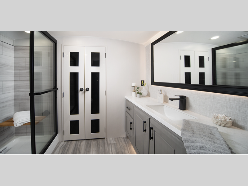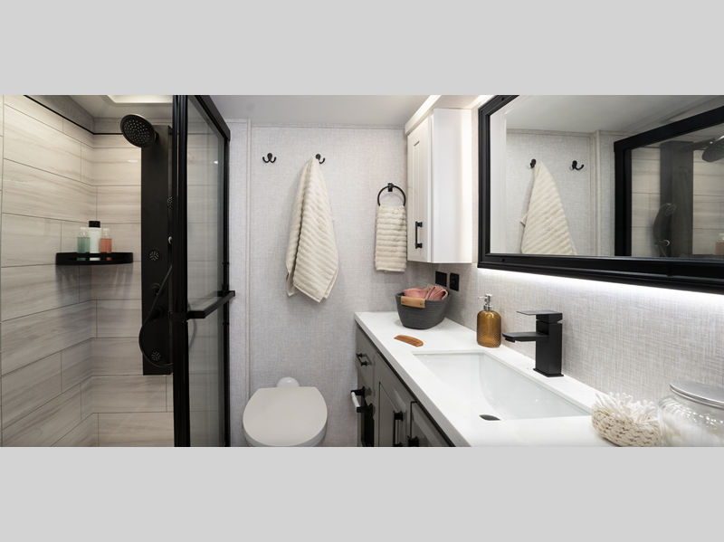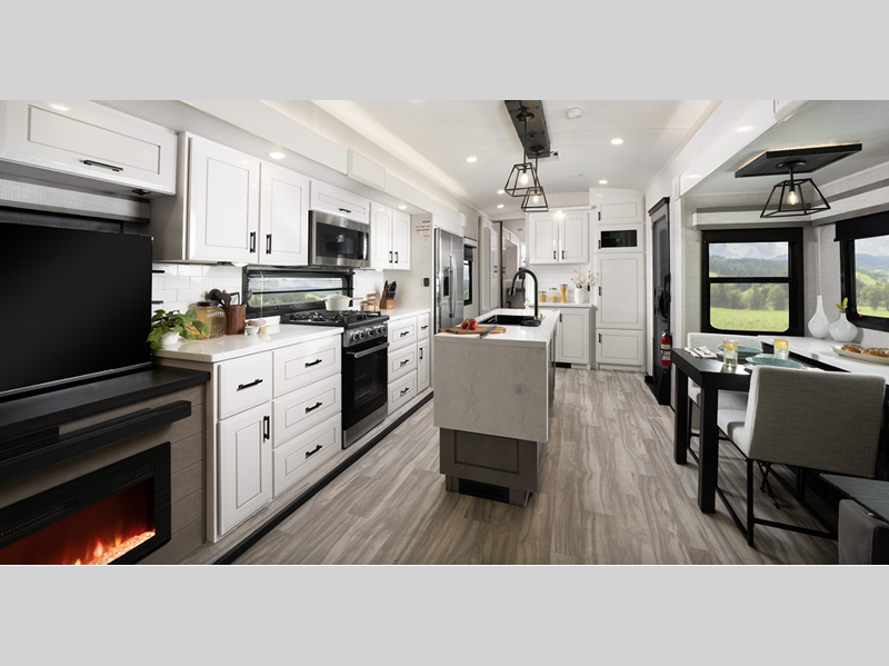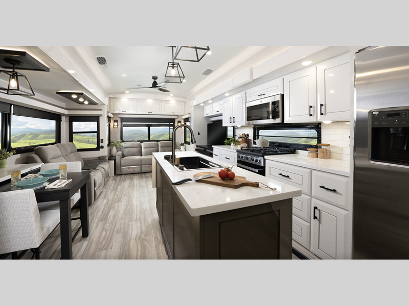 Sleeps 4 Slides 3 Length 43 ft 1 in Ext Width 8 ft 6 in Ext Height 13 ft 4 in Int Height 8 ft 6 in Interior Color Modern Farmhouse, Vintage Farmhouse Exterior Color Midnight Charcoal, Midnight Gold, Silver Metallic Hitch Weight 3370 lbs GVWR 18700 lbs Dry Weight 15290 lbs Cargo Capacity 3410 lbs Fresh Water Capacity 75 gals Grey Water Capacity 87 gals Black Water Capacity 50 gals Tire Size 215/75R17.5"H Furnace BTU 40000 btu Available Beds King Refrigerator Type Residential Refrigerator Size 21 cu ft Convection Cooking Yes Cooktop Burners 4 Number of Awnings 2 LP Tank Capacity 40 lbs. Water Heater Capacity 16 gal Water Heater Type Gas/Electric DSI AC BTU 30000 btu TV Info LR 50" Smart LED HDTV, BR & EXT 32" 4K Smart LED TV Awning Info 11' and 21' Electric with LED Lights Axle Count 2 Washer/Dryer Available Yes Number of LP Tanks 3 Shower Type Shower w/Seat Electrical Service 50 amp Similar Floorplans