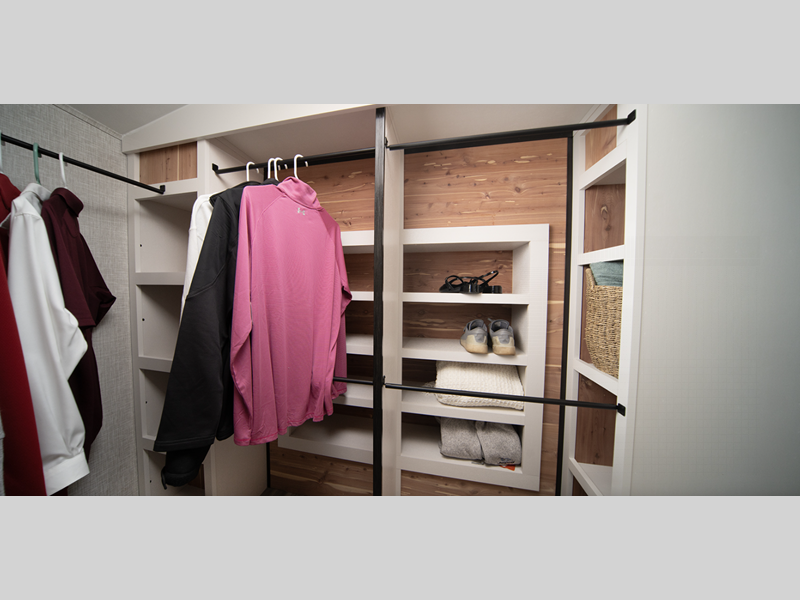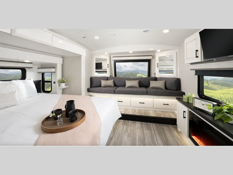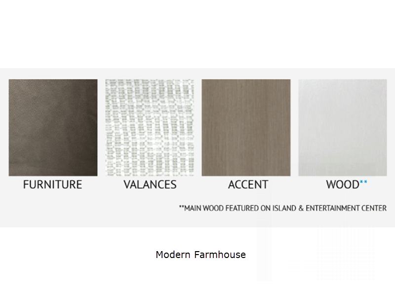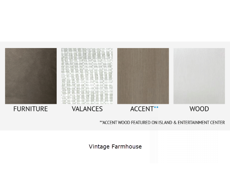 Step inside and find Vintage or Modern Farmhouse interior decor paired with solid hardwood cabinetry, (made in USA) vinyl flooring, and LED accent lighting above the slide outs. You will appreciate the 102" wide body construction creating open living spaces, and each model includes a pass-through storage with Slam-Latch baggage doors so nothing needs to be left behind.