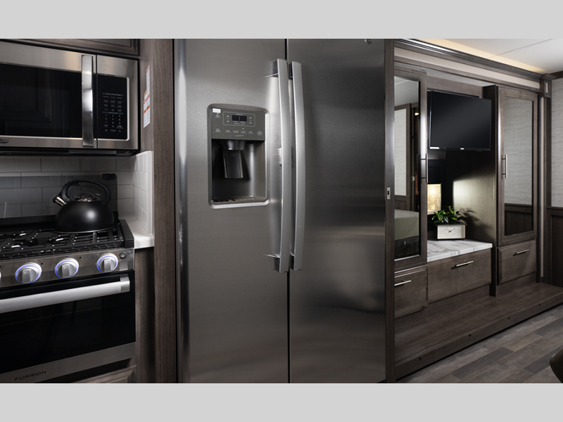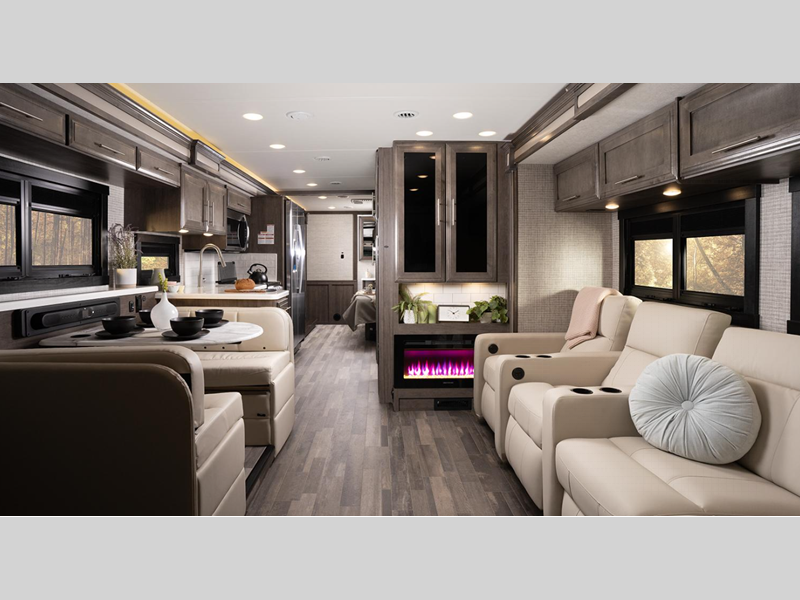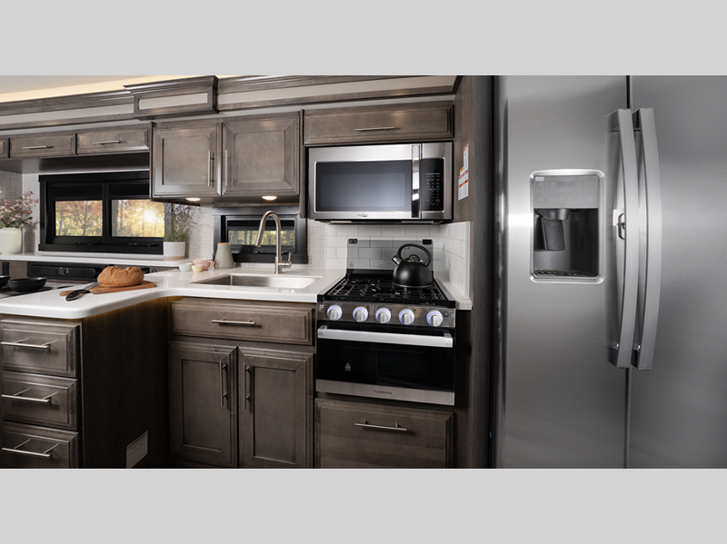 The JRide Plus will provide precise handling and stability as you travel across the state or country, and the Stronghold VBL lamination is the lightest, yet strongest construction in the industry so you can enjoy your coach for years to come. There are solid surface kitchen countertops inside, along with decorative kitchen backsplash, hardwood cabinet doors, and large wardrobes to easily store your belongings.