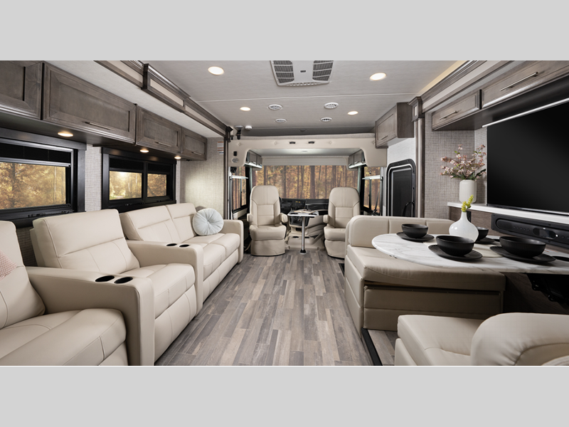 Sleeps 5 Slides 2 Length 36 ft 11 in Ext Width 8 ft 5 in Ext Height 12 ft 10 in Int Height 7 ft Interior Color Benton, Modern Farmhouse Exterior Color Standard Graphics. Full-Body Paint; Java, Soul Blue Hitch Weight 5000 lbs GVWR 22000 lbs Fresh Water Capacity 72 gals Grey Water Capacity 40 gals Black Water Capacity 40 gals Tire Size 235/80R22.5G Furnace BTU 30000 btu Generator 5,500-Watt Fuel Type Gasoline Engine 7.3L V8 Chassis Ford F53 Horsepower 335 hp Fuel Capacity 80 gals Wheelbase 228 in Available Beds King Torque 468 ft-lb Refrigerator Type Residential Cooktop Burners 3 Shower Size 30" x 36" Number of Awnings 1 LP Tank Capacity 16.5 gals Water Heater Capacity 10 gal Water Heater Type Gas/Electric AC BTU 28500 btu Basement Storage 117 cu. ft. TV Info LR 39" LED HD Smart TV, BR LED HD Smart TV, Exterior LED HD Smart TV Awning Info 18' Electric with LED Lights Washer/Dryer Available Yes Gross Combined Weight 26000 lbs Shower Type Standard Electrical Service 50 amp Similar Floorplans