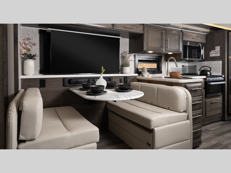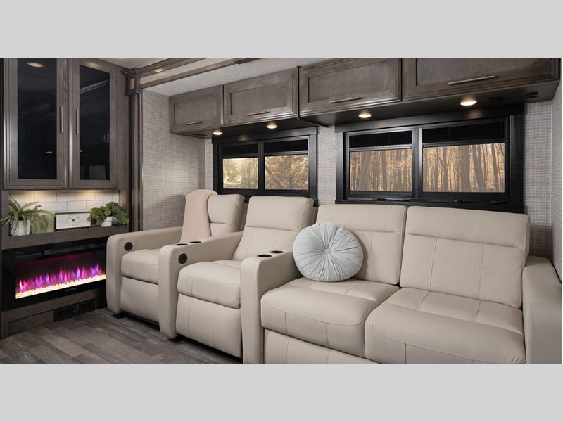 Sleeps 7 Slides 3 Length 38 ft 10 in Ext Width 8 ft 5 in Ext Height 12 ft 10 in Int Height 7 ft Interior Color Benton, Modern Farmhouse Exterior Color Standard Graphics. Full-Body Paint; Java, Soul Blue Hitch Weight 5000 lbs GVWR 24000 lbs Fresh Water Capacity 72 gals Grey Water Capacity 40 gals Black Water Capacity 40 gals Tire Size 255/80R22.5G Furnace BTU 60000 btu Generator 5,500-Watt Fuel Type Gasoline Engine 7.3L V8 Chassis Ford F53 Horsepower 335 hp Fuel Capacity 80 gals Wheelbase 252 in Number Of Bunks 2 Available Beds King Torque 468 ft-lb Refrigerator Type Residential Cooktop Burners 3 Shower Size 32" x 32" Number of Awnings 1 LP Tank Capacity 16.5 gals Water Heater Capacity 10 gal Water Heater Type Gas/Electric AC BTU 28500 btu Basement Storage 111 cu. ft. TV Info LR 39" LED HD Smart TV, BR LED HD Smart TV, Ext. LED HD Smart TV Awning Info 12' Electric with LED Lights Washer/Dryer Available Yes Gross Combined Weight 30000 lbs Shower Type Radius Electrical Service 50 amp Similar Floorplans