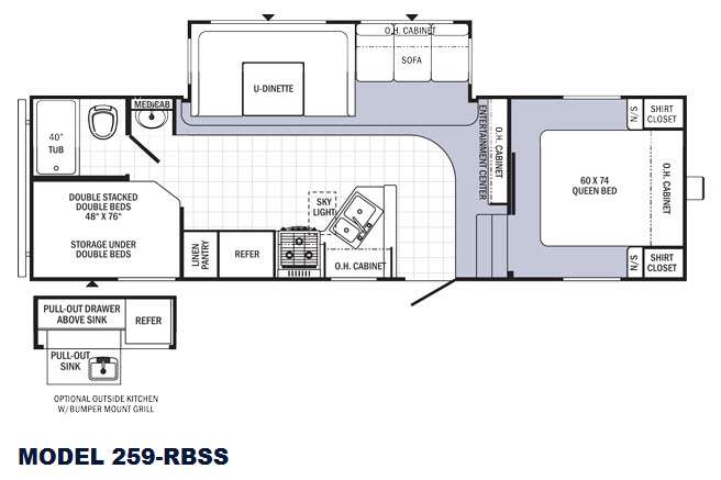 | Fresh Water Capacity | 51 gals | Grey Water Capacity | 74 gals |