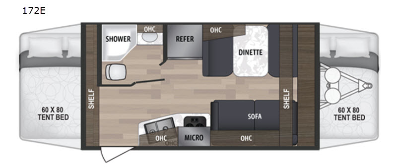 Camping just got easier with this ready-to-go expandable. Last-minute plans are acceptable to make because of its ultra-light technology and fully-loaded interior. Once you load up all of your camping essentials, you can head out to find your favorite campsite. The two queen tent beds provide a cozy and comfortable place to sleep each night, and the full bathroom allows you to skip using the public facilities. During the day, just imagine visiting with family and friends relaxing on the sofa or booth dinette in the living area while dinner is being prepared in the kitchen with full amenities. You will find shelves and cabinets throughout to store all your things. Take a look!